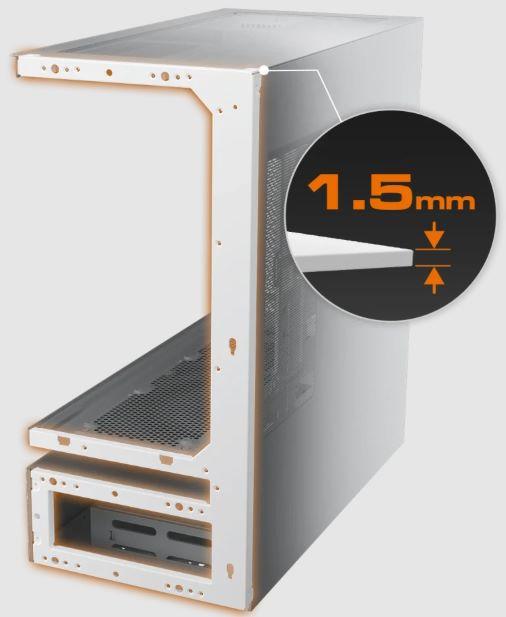 Un bastidor de acero de 1,5 mm de grosor refuerza el chasis, preservando la integridad estructural incluso con el diseño de ventilación central suspendida. El resultado es una arquitectura audaz y abierta que se mantiene rígida, fiable y lista para compilaciones de alto rendimiento.