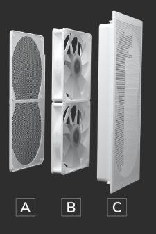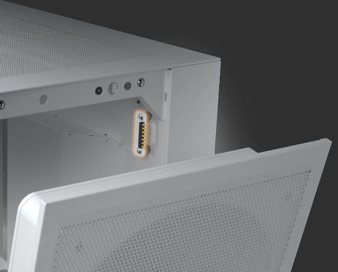 El módulo frontal 3 en 1 —que fusiona el filtro de polvo, dos ventiladores ARGB PWM de 160 mm preinstalados y el panel de malla en una sola unidad preensamblada— te permite realizar el mantenimiento en un solo paso fluido.
