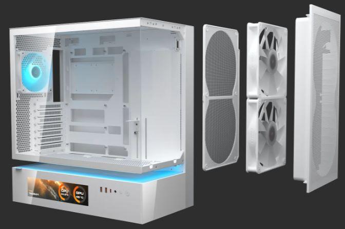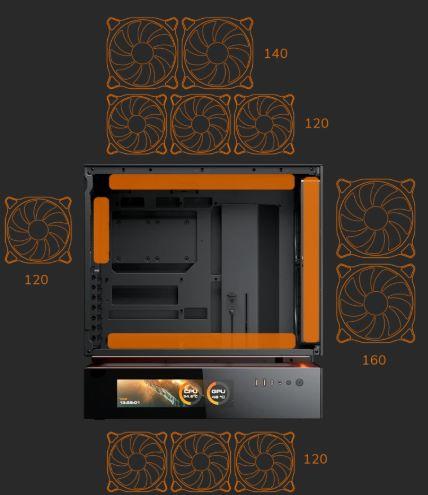 El CFV235 Mesh Vision tiene una capacidad de ventilador de 3x120mm o 2x140mm en la parte superior, 3x120mm en el suelo de la cámara principal, 2 ventiladores de 160mm en la parte delantera y 1x120mm en la parte trasera (2x160mm y traseros ARGB PWM vienen preinstalados). El soporte de refrigeración líquida alcanza un máximo de 360 mm en la parte superior.