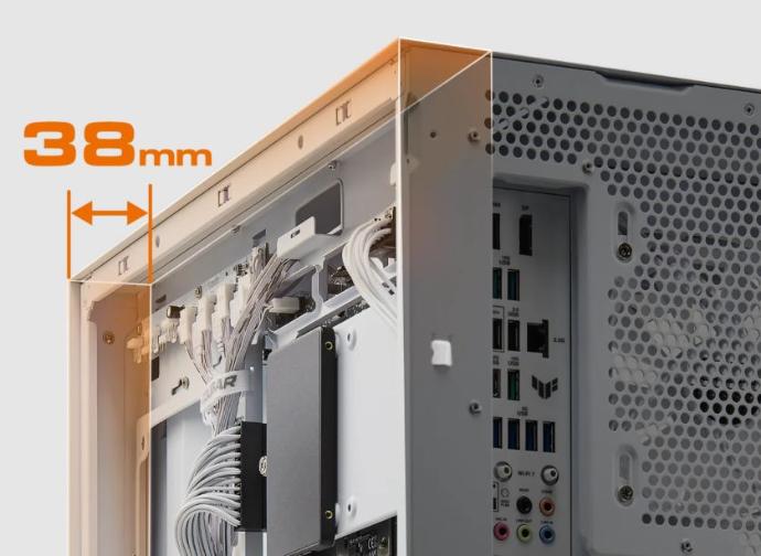 38 mm de espacio detrás de la bandeja de la placa base mejora la gestión de los cables, ofreciendo más espacio para enrutar y ocultar cables de diferentes grosores. Cinco correas ajustables de Velcro ofrecen opciones versátiles para asegurar y ordenar tu diseño.