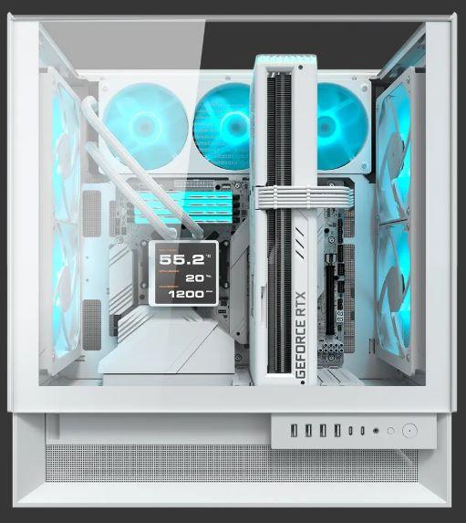Primer -y único- gabinete de PC en el mercado con ventiladores PWM cuádruples de 160 mm preinstalados, el OmnyX ofrece un flujo de aire superior directamente desde el gabinete, con espacio para una capacidad total de 7 ventiladores. La alineación reflejada delantera-trasera crea un efecto jetstream naturalmente fuerte, con dos ventiladores montados en la parte delantera aspirando aire frío y dos ventiladores montados en la parte trasera expulsando aire caliente directamente y sin interrupciones. Una distribución equitativa de ventiladores con aspas reversas y delanteras permite modos de admisión flexibles, creando un flujo de aire suave y direccionalmente consistente sin importar la forma en que decida orientar su estructura.