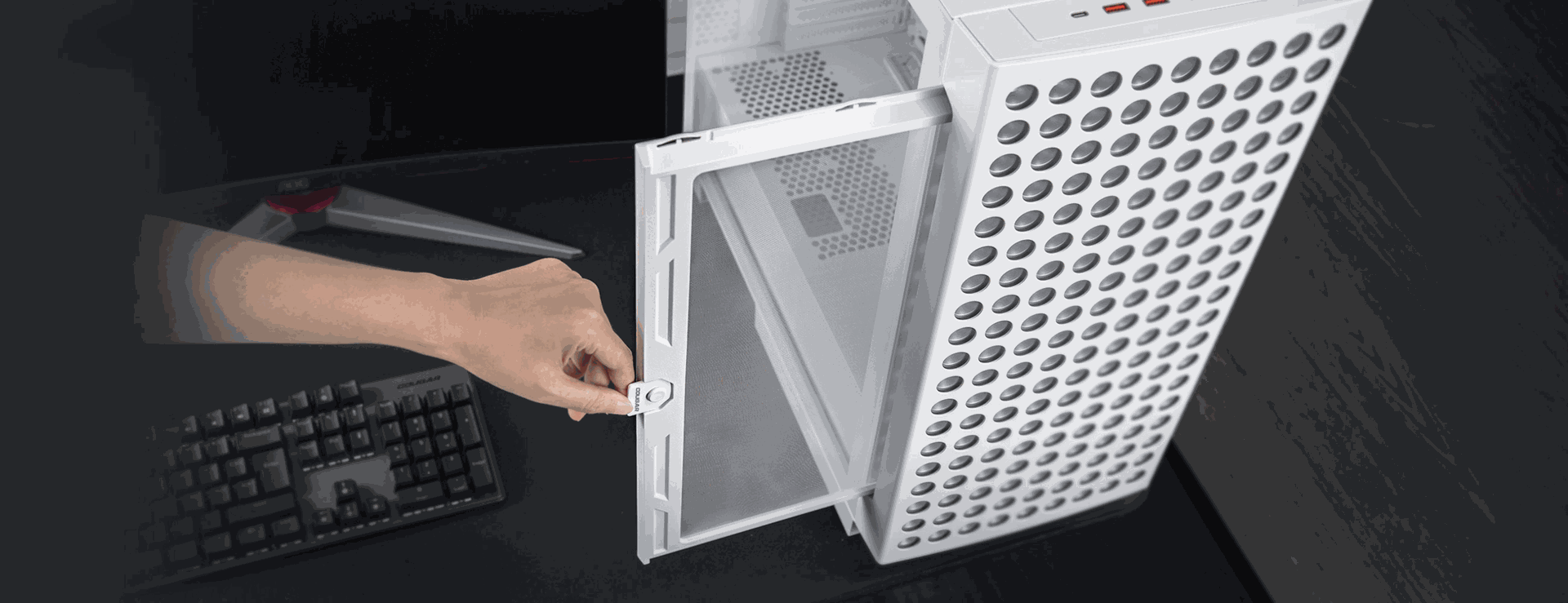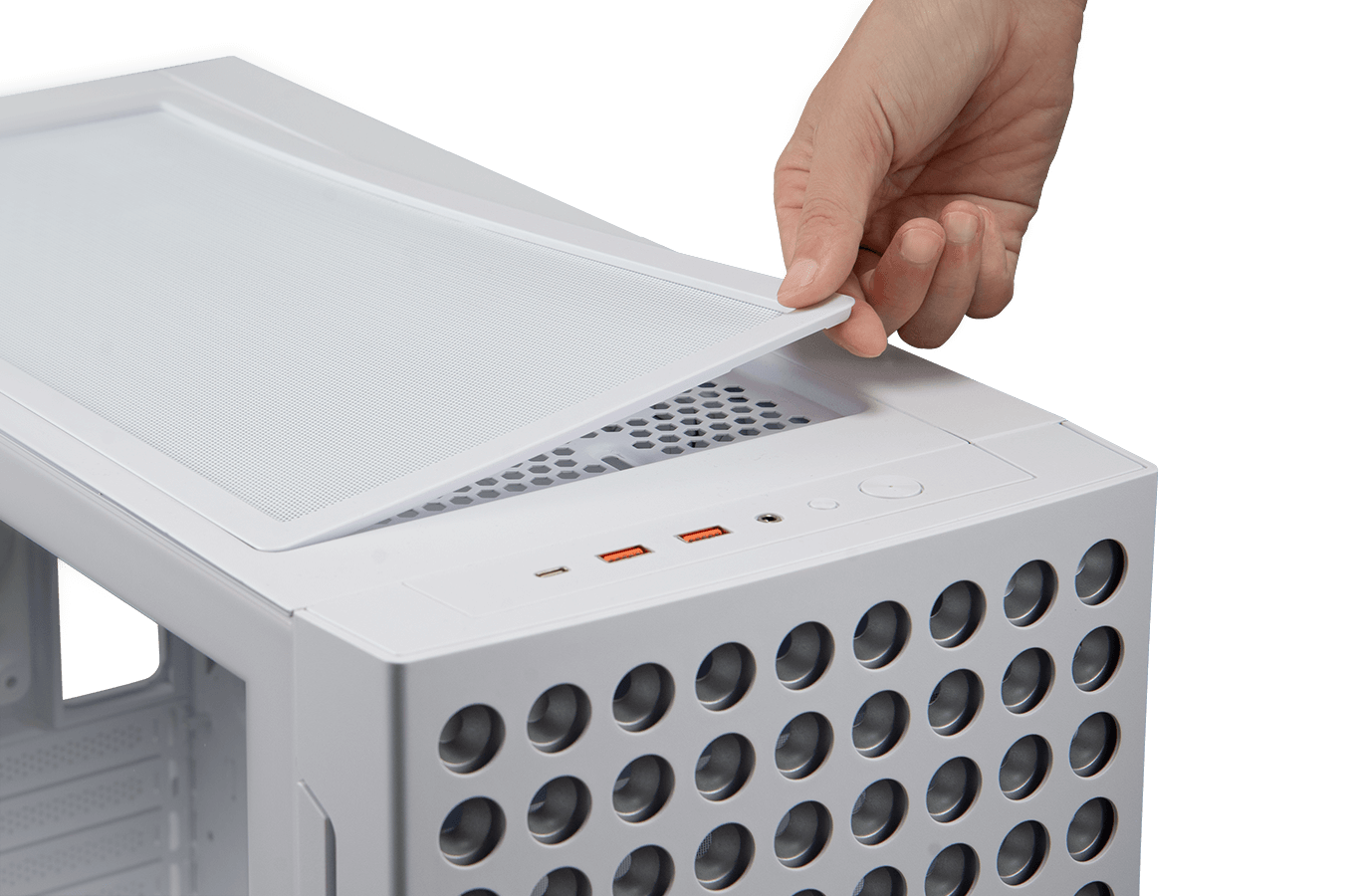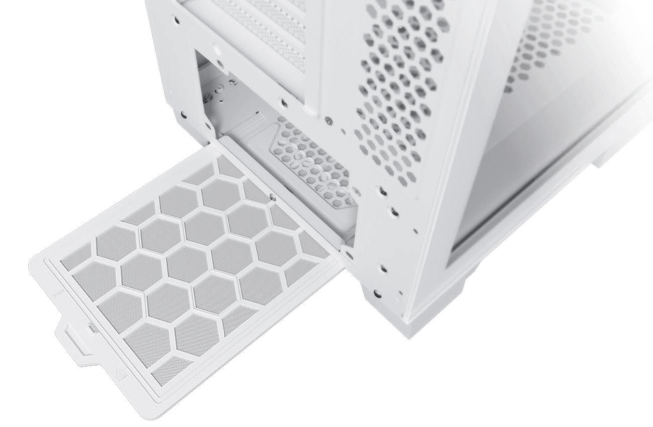 Los filtros en los tres lados ventilados (frontal, superior e inferior) evitan eficazmente la entrada de polvo, lo que mantiene limpios los componentes. El filtro de polvo deslizante rápido frontal se extrae sin quitar el panel frontal, lo que facilita el mantenimiento, y la adición de una etiqueta de goma aumenta la facilidad de uso al proporcionar un mejor agarre del filtro. El filtro del lado superior se fija magnéticamente mientras que el filtro inferior se desliza hacia afuera para facilitar su extracción.