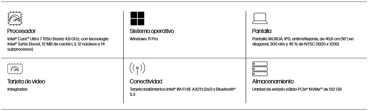 - Procesador Intel Core Ultra 5-125U @ 1.3GHz base