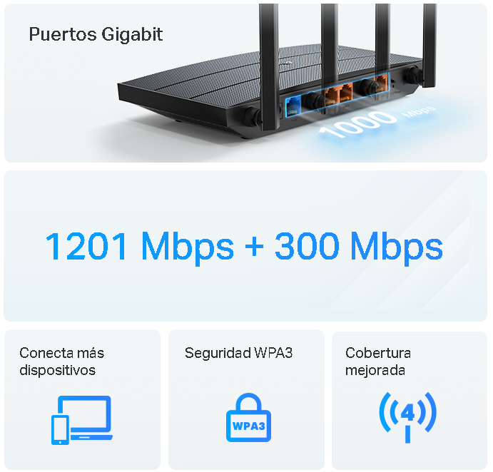 Todos los puertos Ethernet Gigabit te permiten aprovechar al máximo tu velocidad de banda ancha de hasta 1 Gbps. Conecta tus PC, Smart TVs y consolas de juegos a uno de los tres puertos LAN Ethernet Gigabit para conexiones por cable rápidas y confiables.