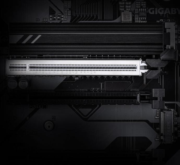 El diseño de blindaje de acero inoxidable de una sola pieza de GIGABYTE refuerza las ranuras PCIe, proporcionando la resistencia extra necesaria para soportar tarjetas gráficas pesadas.