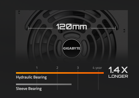 El ventilador de 120 mm detecta el uso de energía actual y la temperatura, ajustando automáticamente su velocidad de rotación para minimizar el ruido. El ventilador con cojinete hidráulico ofrece una vida útil más larga y estable en comparación con el ventilador de manga tradicional.