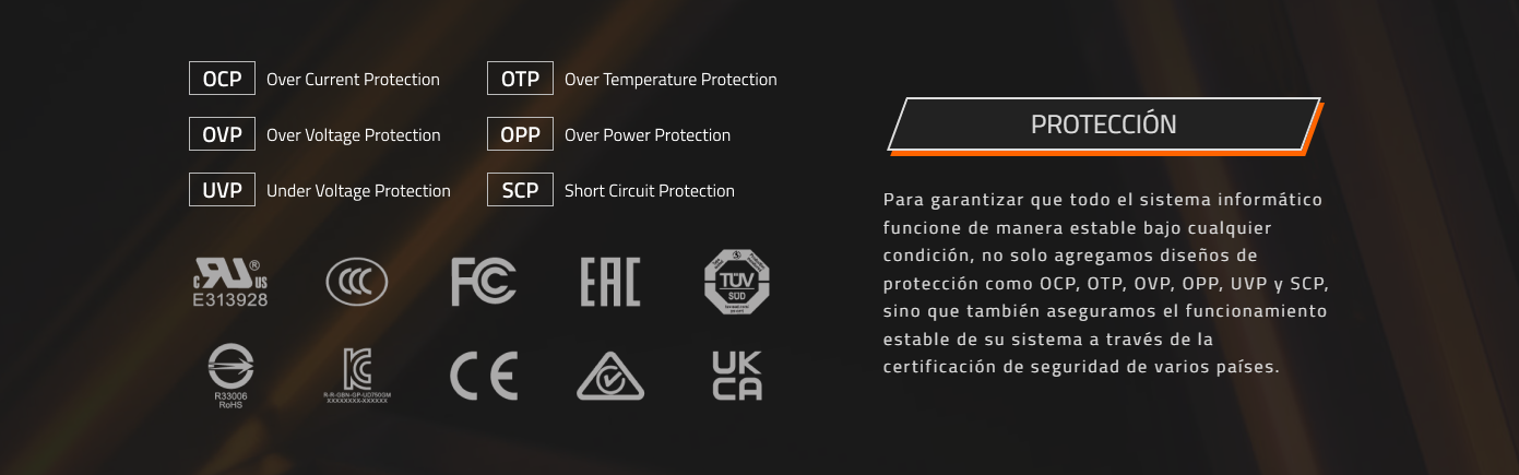 - Protección OVP/OPP/SCP/UVP/OCP/OTP