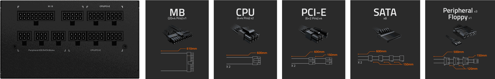 - PCI-e 6+2 pines x 4: 600 mm+150 mm*2