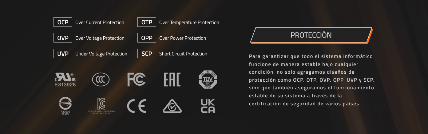 - Protección OVP/OPP/SCP/UVP/OCP/OTP
