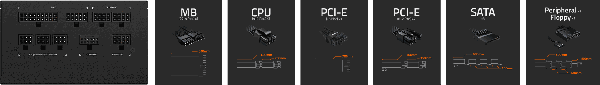 - SATA x 8: 600 mm+150 mm+150 mm+150 mm*2
