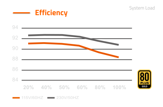 La certificación 80 Plus Gold garantiza ofrecer un 90% de eficiencia al 50% de carga. La mejor eficiencia energética supone menos desperdicio de energía, menos calor y menos ruido de ventilador.
