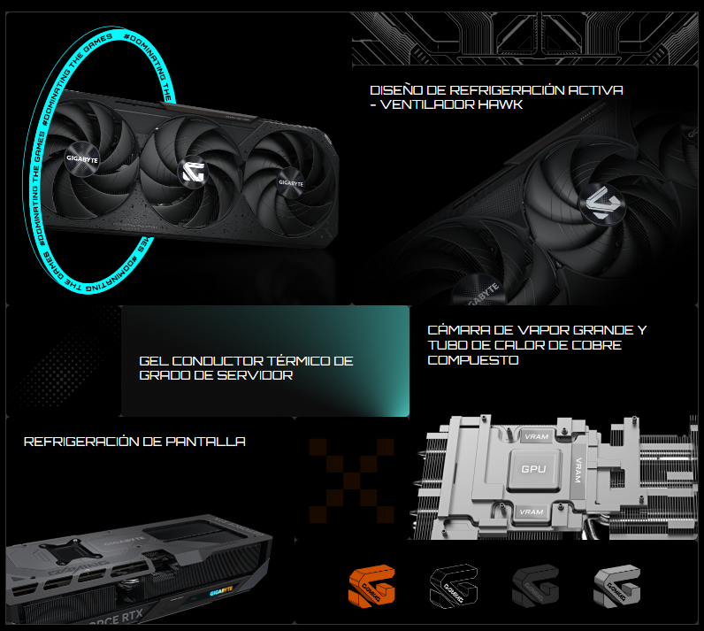 El sistema de refrigeración WINDFORCE ofrece un rendimiento térmico excepcional gracias a una combinación de tecnologías de vanguardia. Incorpora gel conductor térmico de grado servidor, innovadores ventiladores Hawk con giro alterno, tubos de calor de cobre compuesto, una gran cámara de vapor, ventiladores activos 3D y refrigeración por pantalla.