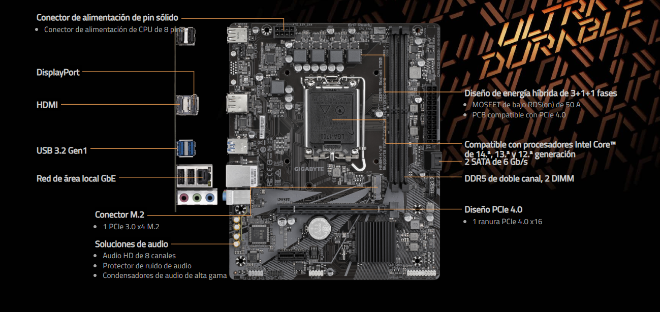 - Soporta 14th, 13th y 12th Gen Procesadores Intel® Core™, Pentium® Gold y Celeron