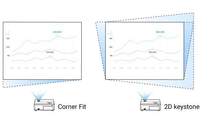 El LH750 está equipado con corrección trapezoidal automática vertical y corrección trapezoidal 2D. El control Corner Fit (ajuste de esquinas) permite ajustar cada esquina de manera independiente para una imagen perfectamente alineada.