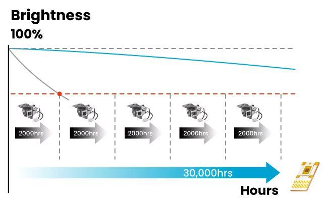 Los proyectores LED LH750 garantizan 30,000 horas de funcionamiento sin mantenimiento, ahorrando costos que superan un valor de más de 15 reemplazos de lámparas a lo largo de su vida útil. Los proyectores LH750 son capaces de mantener un brillo impresionante de manera constante en modo Eco.