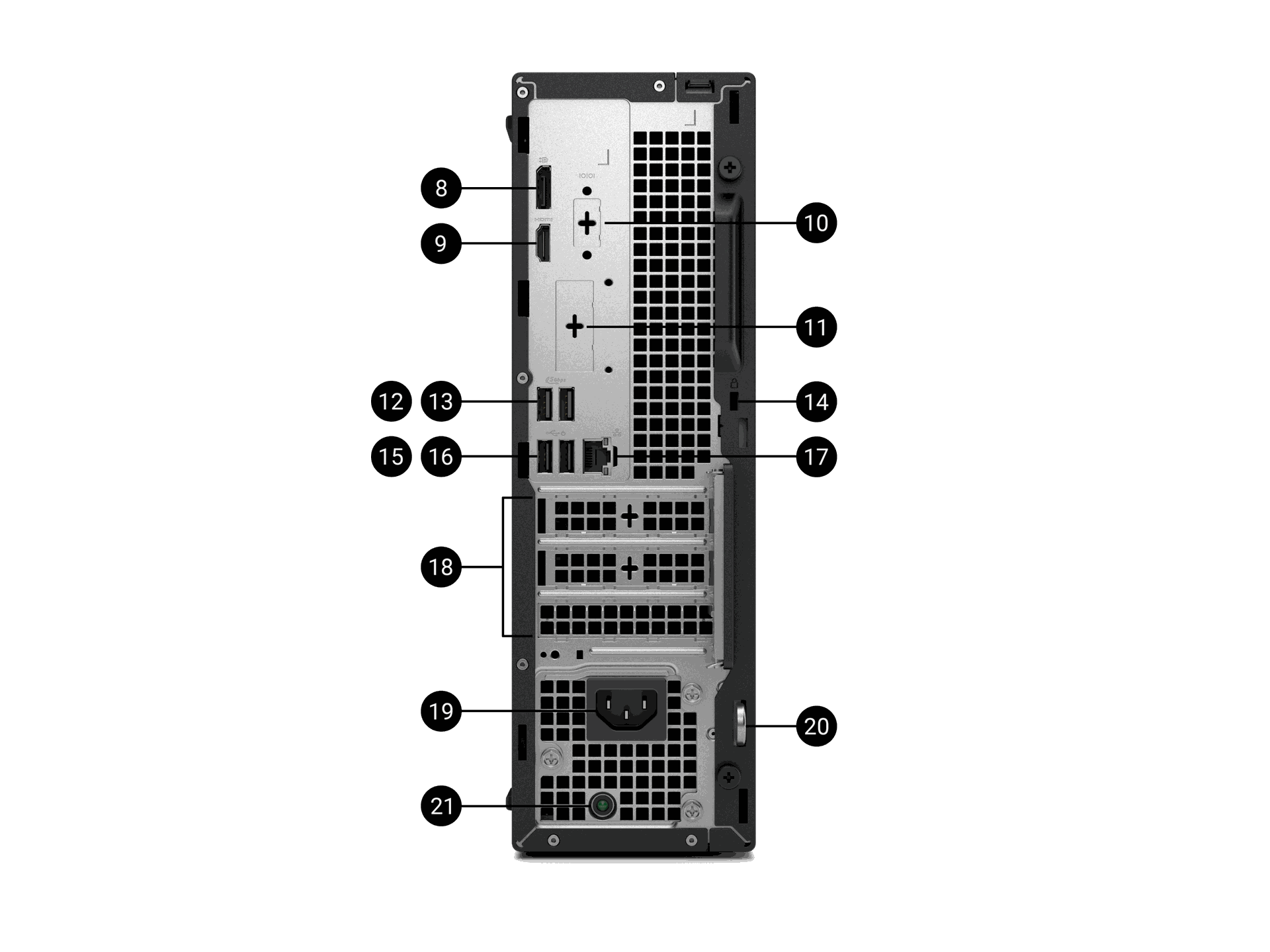 Actualice fácilmente los componentes internos de su computadora de escritorio con un chasis sin herramientas y tres ranuras PCIe expansibles. Las opciones incluyen puertos DP y HDMI que admiten una resolución de hasta 8K para experiencias de video mejoradas, así como Wi-Fi 7.