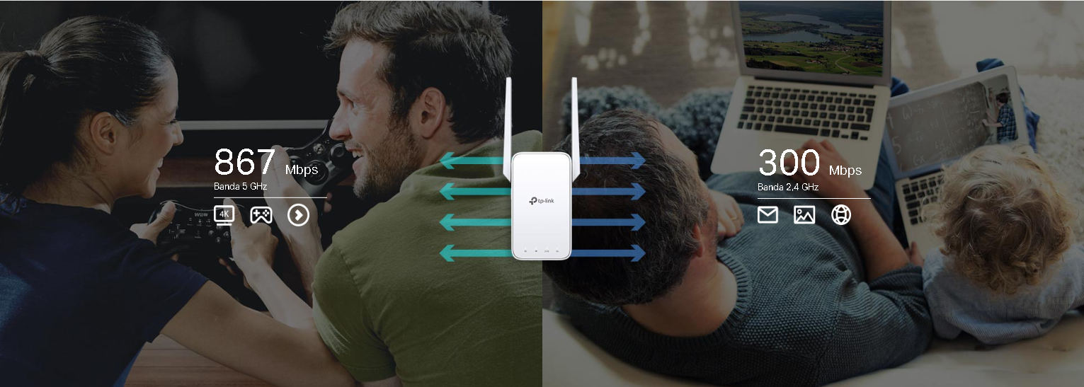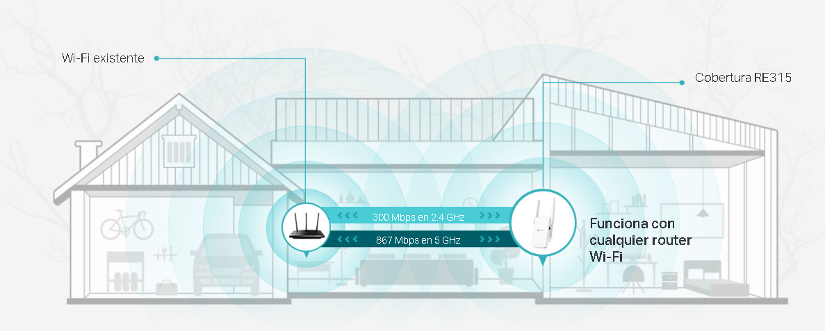El repetidor Wi-Fi RE315 utiliza la doble banda de 2,4GHz y 5GHz para transmitir la señal a internet con un mayor rendimiento. Esto le permite llegar a más dispositivos conectados al mismo tiempo hasta 300Mbps a 2,4GHz y 867Mbps a 5GHz.