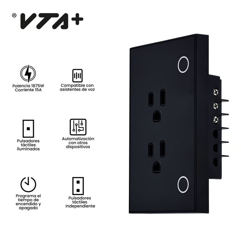 Cuenta con activación remota por aplicación. Incorpora 2 salidas con polo a tierra controladas en conjunto. Automatice y controle el suministro de energía de forma remota a través de su móvil. Programe tiempos de encendido o apagado o cree una cuenta regresiva. Controle junto con otros dispositivos de VTA casa inteligente. Compatible con asistentes de Voz. Activación desde la aplicación menor a 2 segundos. incluye tapa. Cumple con la norma RETIE.
